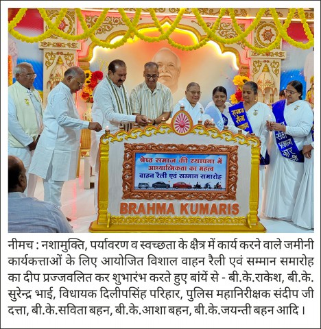 नीमच : दि. 11.10.25 ‘‘ब्रह्माकुमारी संस्थान के भैया बहनों ने जो भी बीड़ा उठाया है उसे अपने अंजाम तक पहुंचाया है, चाहे वो नशा मुक्ति हो या पर्यावरण या स्वच्छता अथवा यातायात के नियमों का पालन हो । सभी सामाजिक क्षैत्रों में ब्रह्माकुमारी संस्थान की कार्ययोजना हमेशा सफल रही है ।’’ उपरोक्त विचार नशामुक्ति, पर्यावरण, स्वच्छता व यातायात के नियमों के प्रचार-प्रसार हेतु निकाली गई विशाल वाहन रैली और इस क्षैत्रों में सेवारत जमीनी कार्यकत्ताओं के सम्मान समारोह में बोलते हुए विधायक दिलीपसिंह परिहार ने व्यक्त किये । आपने नशे का सेवन करने वालों को चेतावनी देते हुए बताया कि ‘‘नशे के कारोबारियों के महल दिनों दिन बड़े होते जा रहे हैं और नशे का सेवन करने वालों के मकान भी झोंपड़ी में बदलते जा रहे हैं और इसका अंत अकाले मृत्यु से होता है।‘‘